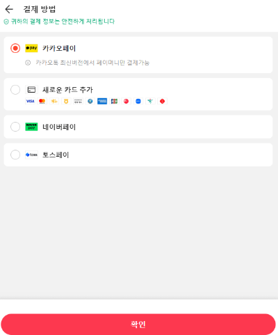 바로 구매 버튼을 누르시고> 배송주소> 결제방법을 선택합니다. 카카오페이를 이용할 수도 있고, 네이버페이나 토스페이 이용하실 수도 있고, 카드를 직접 추가해서 결제하실 수도 있습니다. 결제하시면 주문완료입니다.