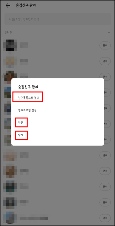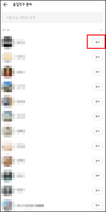 6. 숨김처리된 친구 중 다시 불러올 친구를 선택 후 관리버튼을 눌러줍니다.