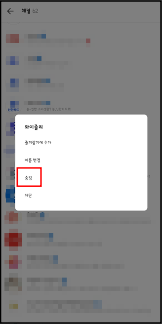 2. 선택메뉴중 숨김을 눌러줍니다. 그러면 친구목록에서 그 친구가 사라지게 되며, 이제 보이지 않게 됩니다.