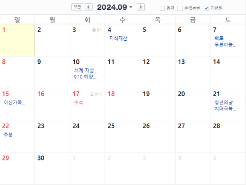 9월에는 추석 연휴가 찾아옵니다. 추석도 한국의 대표적 명절 중 하나로 가족이 함께 할 수 있는 좋은 시간입니다. 9월 추석연휴는 15일 일요일부터 28일 수요일까지입니다. 토요일부터 쉴 수 있으니 올해 가장 긴 연휴기간이 될 것 같습니다. 연차까지 이용하시는 분들은 아주 긴 휴일을 즐기실 수 있을 것 같습니다. 10월에도 3일 목요일 개천절과 9일 수요일 한글날이 있습니다. 9월과 10월에는 쉬는 날이 많아서 너무 좋은 것 같습니다.