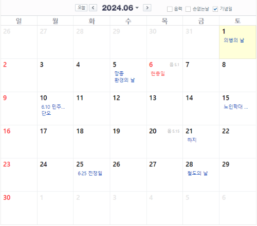 5월에는 어린이날이 일요일에 들어갔습니다. 그래도 다행히 대체공휴일이 주어져서 6일 월요일에 쉴 수 있습니다. 6월에는 목요일에 현충일이 있습니다.
