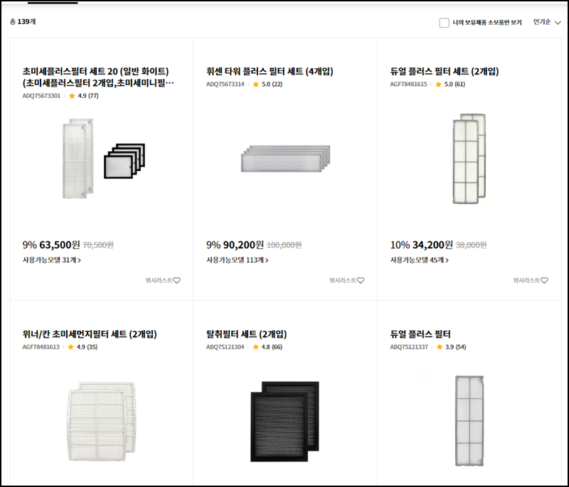 케어용품/소모품> 에어컨을 선택 아시면 아래와 같이 종류별 필터를 확인하실 수 있습니다. 요즘 초미세 먼지가 극성이기 때문에 초미세플러스필터 세트도 많은 분들이 구매를 하시는 것 같아요.