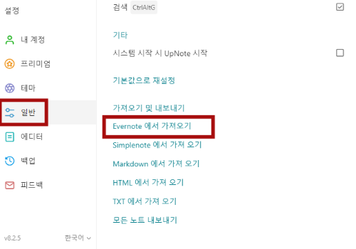 설정> 일반> Evernote 에버노트에서 가져오기
