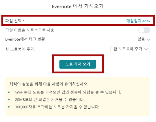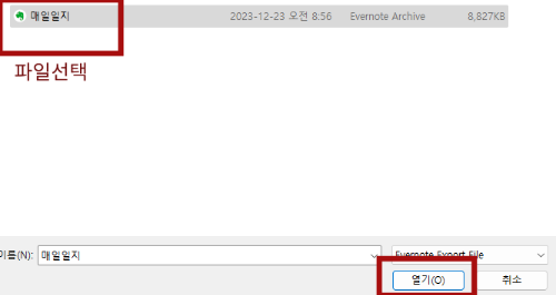 그다음 에버노트에서 저장한 파일을 선택하고 노트 가져오기 버튼을 누르면 완성입니다.