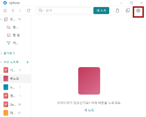 그다음 Upnote 업노트로 갑니다. 먼저 로그인한 첫 화면에서 톱니바퀴 모양의 설정을 누릅니다. 그다음 일반선택, Evernote 에버노트에서 가져오기 선택합니다.